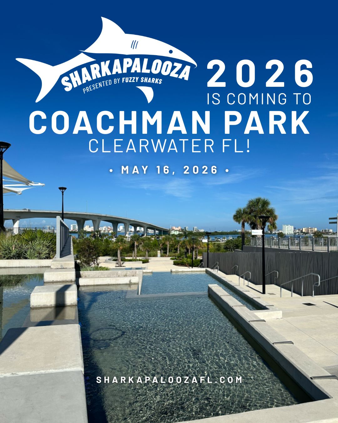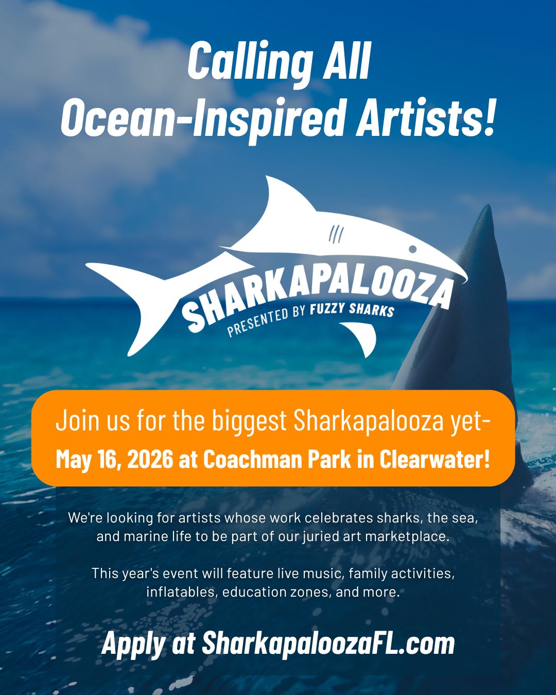 Sharkapalooza 2026 is a free, family-friendly, art-driven ocean conservation festival designed to engage the public through creativity, education, and community connection. The event will take place on Saturday, May 16, 2026, from 10:00 AM to 4:00 PM at Coachman Park, Clearwater, Florida. Sharkapalooza’s mission is to raise awareness for ocean and shark conservation by bringing together artists, educators, conservation organizations, and the local community in an accessible, engaging setting.