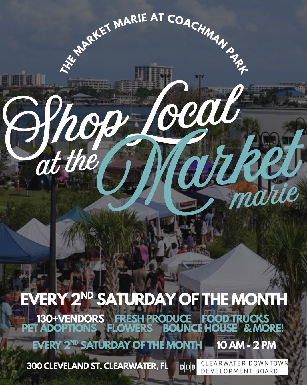 The Market Marie hosts a monthly market on the second Saturday of each month at Coachman Park, showcasing 130+ locally owned vendors and artisans. The market is designed to support small businesses, foster community connection, and activate downtown Clearwater through consistent, high-quality public programming.